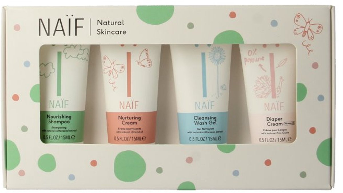 Weekendje weg op de planning? Baby van een vriendin op komst? De Naïf Mini Set is ideaal voor onderweg, op vakantie of als kraamcadeautje. Alle producten in handig reisformaat, dus nemen weinig ruimte in beslag in de tas. Vier babyproducten met natuurlijke ingrediënten die de huid en het haar voeden en verzorgen. Dat noemen we dus worry free verzorging.